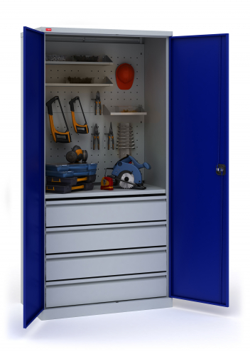В комплектацию шкафа ИП-1/7 входит: корпус шкафа, двери, 1 полка ИП-1, 2 перфорированных экрана ИП-1, 4 выдвижных ящика, 2 удлиненные полки, 1 укороченная полка, 1 держатель ключей, 10 крючков длиной 5см. Шаг перфорации для установки полок 83 мм. Нагрузка на полку - 60 кг, на ящик - 30 кг. Шкаф оборудован ключевым замок повышенной секретности и ригельной системой запирания.