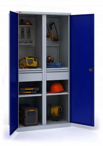 Инструментальный шкаф ИП-2/1 двухсекционный предназначен для хранения инструментов, слесарных приспособлений и других изделий на предприятиях, в мастерских, гаражах, подсобных помещениях. Представляет собой сборно-разборную металлическую конструкцию, собираемую при помощью саморезов.