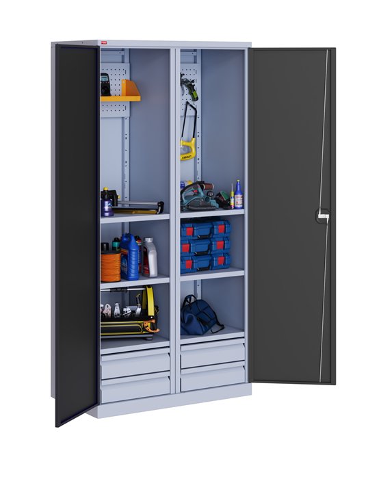 В комплектацию инструментального шкафа ИП-2/2 входит: корпус шкафа, двери, вертикальная перегородка, 6 полок ИП-2, 2 перфорированных экрана ИП-2, 4 выдвижных ящика ИП-2, 2 укороченные полки, 10 крючков длиной 5см. Нагрузка на полку - 60 кг, на ящик - 30 кг. Шкаф оборудован ключевым замок повышенной секретности и ригельной системой запирания.