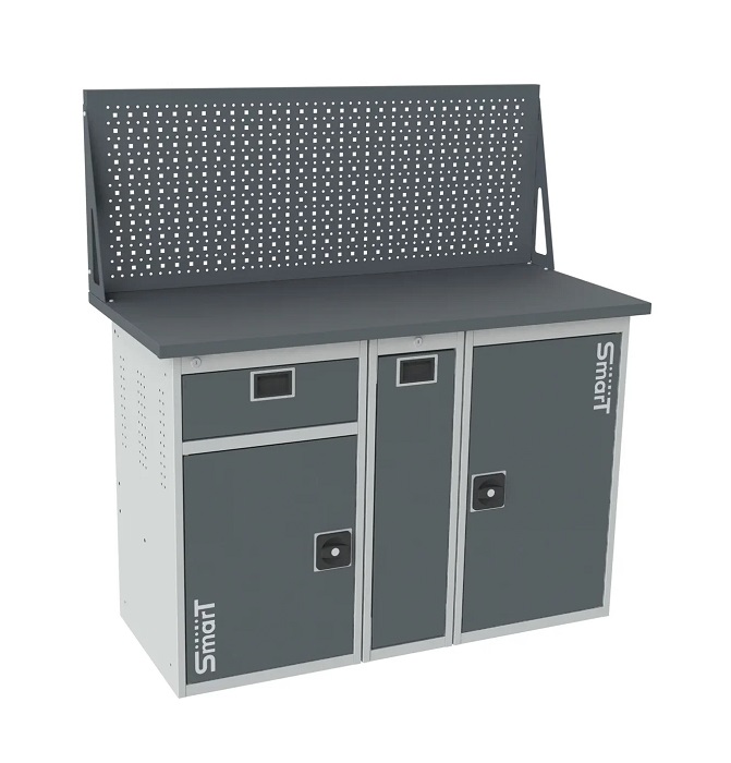 В комплектацию верстака входит: столешница 1280 SMART, тумба SMART 1, тумба SMART 1-1, тумба-пенал SMART, один перфорированный экран SMART. Столешница выполнена из фанеры 27 мм со стальной окрашенной накладкой 1,2 мм. Тумба SMART 1-1 комплектуется одной дверью, одним выдвижным ящиком и одной полкой. Тумба SMART 1 комплектуется одной дверью и одной полкой. Тумба-пенал SMART выдвигается на четырех телескопических направляющих и предназначена для хранения крупногабаритных инструментов и аксессуаров. Все тумбы закрываются ключевым цилиндровым замком. Секретность замка 2000 комбинаций (2 ключа в комплекте). Внутренние стенки дверей имеют универсальную перфорацию для размещения навесных элементов. Перфорированный экран SMART имеет универсальную перфорацию для размещения различного типа крючков и держателей инструмента. Шаг квадратной перфорации (10 мм) - 38х38 мм, круглой (7 мм) - 25х38 мм. Возможна смена стороны открывания двери тумбы. Цвет верстака: корпус тумб - серый Ral 7035, столешница, двери тумб, лицевая панель ящиков - графит Ral 7016. Поставляется в разобранном виде.