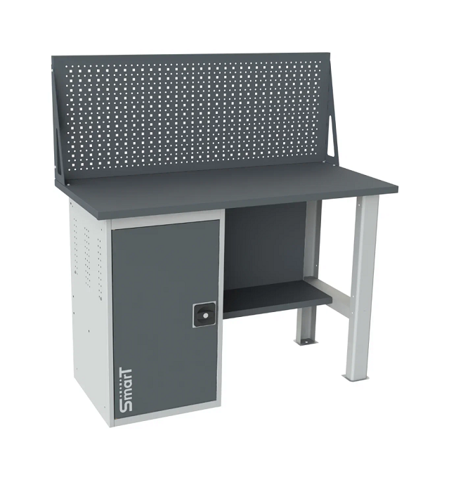 В комплектацию верстака входит: столешница 1280 SMART, полка/стенка 625 SMART, тумба SMART 1, опора SMART, один перфорированный экран SMART. Столешница выполнена из фанеры 27 мм со стальной окрашенной накладкой 1,2 мм. Опора сварная выполненная с применением высокоточного сварочного оборудования. Имеет нижнюю перекладину для усиления устойчивости конструкции. Размер опоры (ВхШхГ): 835х500х135 мм. Тумба SMART 1 комплектуется одной дверью и одной полкой. Закрываться ключевым замком с поворотной ручкой. Секретность замка 2000 комбинаций (2 ключа в комплекте). Внутренняя стенка двери имеют универсальную перфорацию для размещения навесных элементов. Шаг квадратной перфорации (10 мм) - 38х38 мм, круглой (7 мм) - 25х38 мм. Возможна смена стороны открывания двери тумбы. Перфорированный экран SMART имеет универсальную перфорацию для размещения различного типа крючков и держателей инструмента. Шаг квадратной перфорации экрана (10 мм) - 38х38 мм, круглой (7 мм) - 25х38 мм. Цвет верстака: опора, корпус тумбы - серый Ral 7035, столешница, полка/стенка, лицевая панель тумбы, экран - графит Ral 7016. Поставляется в разобранном виде.