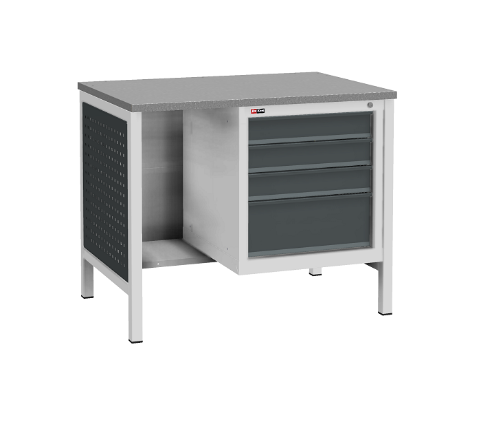 Цвет верстака: серый Ral 7038, панель облицовочная и лицевая панель ящиков/дверей антрацит Ral 7016. Тип покрытия: эпоксидная порошковая краска. Поставляется в разобранном виде