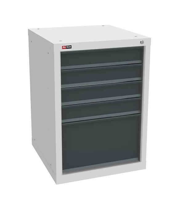 В комплектацию верстака входит: столешница ВЛ-К 150, полка и стенка ВЛ-К, тумба ВЛ-К-010, тумба ВЛ-К-015. Столешница выполнена из фанеры (24 мм) с покрытием из оцинкованного листа металла. Тумба ВЛ-К-010 комплектуется двумя полками и дверью. Тумба ВЛ-К-015 комплектуется 5 выдвижными ящиками с телескопическими направляющими. Полезный размер ящиков (ВхШхГ): 1-280х459х459 мм, 4-80х459х459 мм. Тумба закрывается центральным ключевым замком (50 000 циклов). Опора сварная. Размер опоры (ВхШхГ) - 800х40х660 мм.