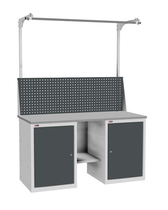В комплектацию верстака входит: столешница ВЛ-К 150, полка и стенка ВЛ-К, две тумбы ВЛ-К-010, один перфорированный экран ВЛ-К-150-Э2. Столешница выполнена из фанеры (24 мм) с покрытием из оцинкованного листа металла. Тумба ВЛ-К-010 комплектуется двумя полками и дверью. Тумба закрывается центральным ключевым замком (50 000 циклов). Перфорированный экран предназначен для размещения навесных аксессуаров. В комплекте экрана: один экран, комплект упоров, две стойки, перекладина-направляющая. Размер квадратной перфорации 10х10 мм, шаг установки аксессуаров 35 мм.