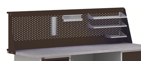Перфорированный экран Э-1,2 черный предназначен для установки на верстаки длиной 1200 мм (ВП-2/1,2, ВП-3/1,2). Изготовлен из металла толщиной 1,2 мм. Экран имеет круглую перфорации диаметром 7 мм. В комплектацию экрана входят два кронштейна для крепления экрана к столешнице верстака. Дополнительно на экран можно установить второй экран Э-1,2В, удлиненную полку, укороченную полку, держатель инструментов, держатель ключей, крючки длиной 80 и 50 мм. Цвет: черный муар Ral 7021. Тип покрытия: порошковое.