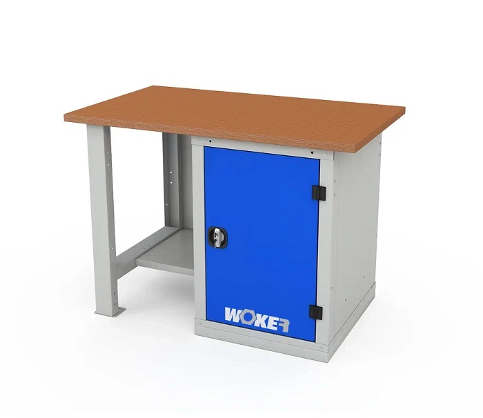 В комплектацию верстака входит: столешница Woker 1200, опора стационарная Woker (нерегулируемая), тумба Woker 01, полка/стенка Woker. Столешница выполнена из шлифованной березовой многослойной фанеры толщиной 30 мм. Снаружи фанера обработана влагостойким антисептиком цвета "красное дерево", что придает фанере повышенную влагостойкость и более темный цвет. Опора изготовлена из цельногнутого стального профиля толщиной 1,5 мм, шириной 80 мм. Полка/стенка выполнена из стального листа толщиной 1 мм. Выдерживает нагрузку -30 кг. Тумба Woker 01 имеет две полки регулируемые по высоте с шагом 50 мм. Полки тумбы установлены на стальные салазки, которые позволяют выдвигать полку на себя на 70% для облегчения разгрузки/погрузки. Дверь тумбы закрывается на цилиндрический ключевой замок со стальной поворотной ручкой, секретность замка 2000 комбинаций. Открывание двери на 180 градусов.