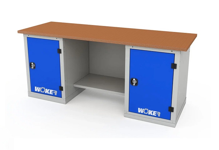 В комплектацию верстака входит: столешница Woker 2000, две тумбы Woker 01, полка/стенка Woker. Столешница выполнена из шлифованной березовой многослойной фанеры толщиной 30 мм. Снаружи фанера обработана влагостойким антисептиком цвета "красное дерево", что придает фанере повышенную влагостойкость и более темный цвет. Полка/стенка выполнена из стального листа толщиной 1 мм. Выдерживает нагрузку -30 кг. Тумба Woker 01 имеет две полки регулируемые по высоте с шагом 50 мм. Полки тумбы установлены на стальные салазки, которые позволяют выдвигать полку на себя на 70% для облегчения разгрузки/погрузки. Дверь тумбы закрывается на цилиндрический ключевой замок со стальной поворотной ручкой, секретность замка 2000 комбинаций. Открывание двери на 180 градусов.